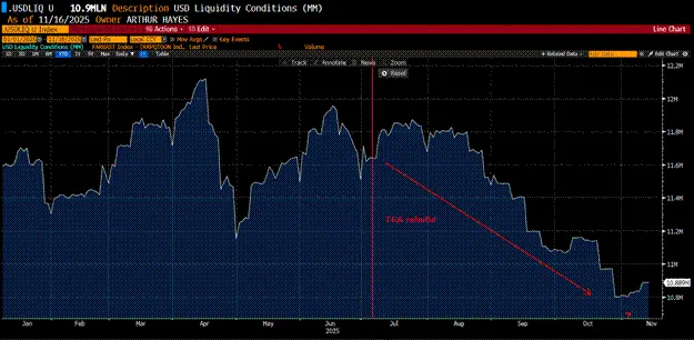 Hayes cites his USD Liquidity Index, which fell about 10% since April. During that same period, Bitcoin had moved higher due to strong inflows into ETFs and digital asset treasury firms. Those inflows have now slowed.