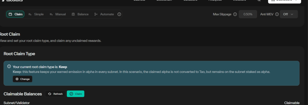 - Change Root Claim Type to “Keep” to get ALPHA tokens.