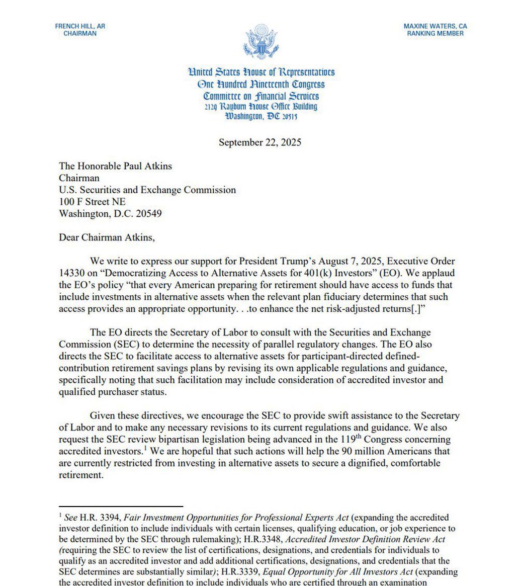 In a letter addressed to SEC Chairman Paul Atkins, they voiced support for President Trump’s recent Executive Order 14330 on “Democratizing Access to Alternative Assets for 401(k) Investors.”