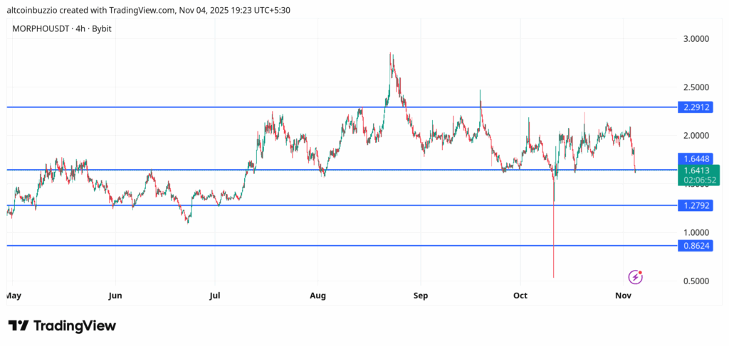 Morpho is trading at $1.66. It is still in range. The next support is at $1.27.