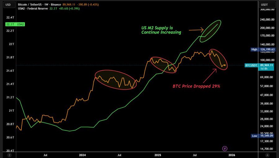U.S. M2 money supply just hit a new ATH, and Bitcoin has always followed it. This chart is one of the strongest signals in crypto right now. M2 has climbed back to $22.3 trillion, and it is rising at the fastest pace since mid-2022. This is a clear sign that liquidity in the U.S. is turning again.